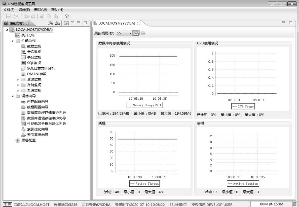 DM性能监视工具是达梦数据库系统管理员用来监视服务器的活动和性能情况,并对系统参数进行调整的客户端工具,它允许系统管理员在本机或远程监视服务器的运行状态。其界面如图1-7所示。