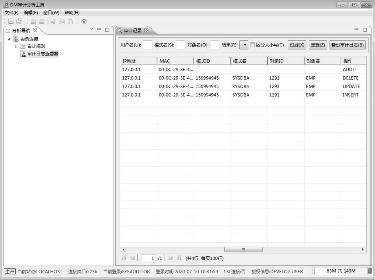 DM审计分析工具是达梦数据库审计日志查看的基本工具。通过使用DM审计分析工具,达梦数据库审计员可以实现审计规则的创建与修改,以及审计记录的查看与导出等功能。DM审计分析工具界面如图1-10所示。