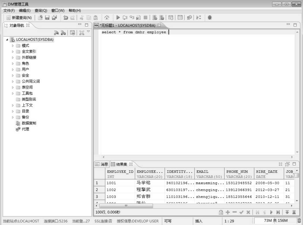 DM管理工具是达梦数据库系统最主要的图形界面工具,用户通过它可以与达梦数据库进行交互——操作数据库对象和从数据库中获取信息。DM管理工具的主要功能包括服务器管理、数据库实例管理、模式对象管理、表对象管理、外部表对象管理、索引对象管理、视图对象管理、物化视图对象管理、存储过程对象管理、函数对象管理、序列对象管理、触发器对象管理、包对象管理、类对象管理、同义词对象管理、全文索引对象管理、外部链接对象管理、角色权限管理、用户权限管理、安全信息管理、表空间对象管理、备份恢复管理、工具包管理、数据复制管理、数据守护管理、作业调度管理等。DM管理工具的界面如图1-6所示。