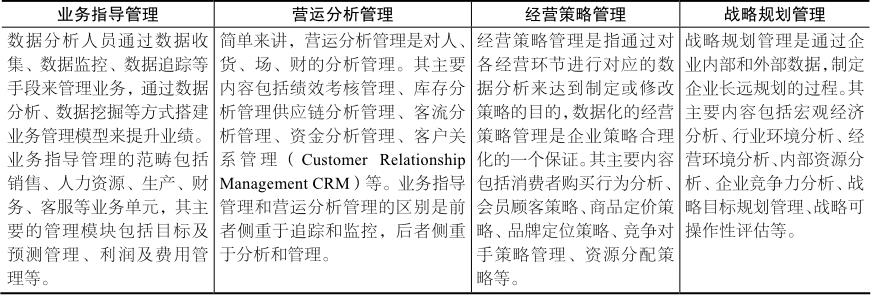 数据化管理是指运用分析工具对客观、真实的数据进行科学分析,并将分析结果运用到生产、营运、销售等各个环节中的一种管理方法。根据管理层次的不同,数据化管理可分为业务指导管理、营运分析管理、经营策略管理、战略规划管理4个由低到高的层次。根据业务逻辑还可以分为销售中的数据化管理、商品中的数据化管理、财务中的数据化管理、人事中的数据化管理、生产中的数据化管理、物流中的数据化管理等。