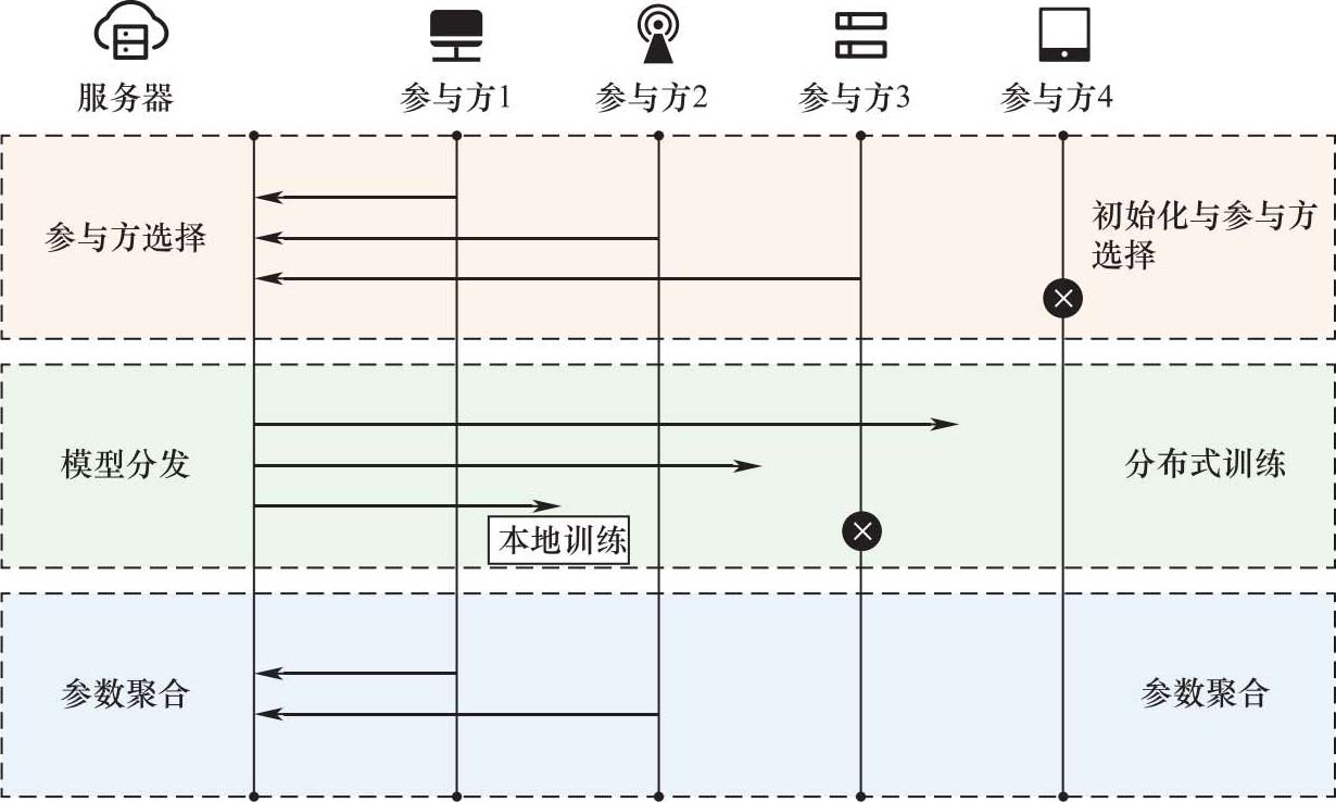 如图1-2所示,联邦学习的生命周期可以被划分为多个连续的通信轮,在这些轮次之间不断地迭代,并在全局模型达到预期的精度时停止。