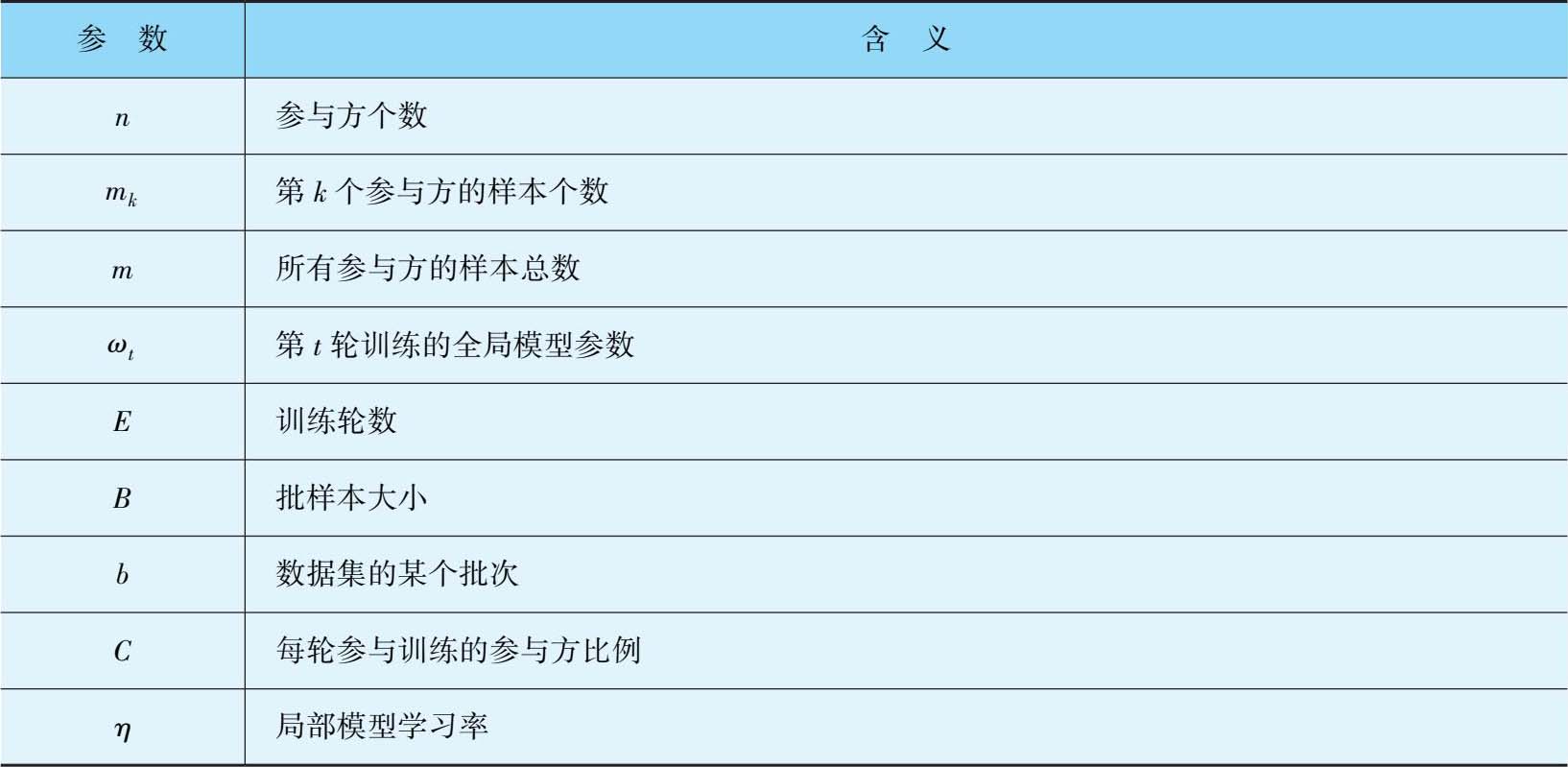 FeAvg算法的框架如图3-2所示,参数及含义见表3-2。