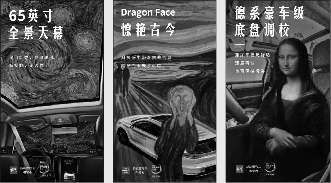 在竞争激烈的汽车市场上,除了产品和综合实力的比拼,各大品牌在文案创意方面的竞争也趋于白热化。作为一个有想法、有创新精神的汽车品牌,比亚迪汽车在文案创意方面一直表现得十分出色。其突破传统营销模式的局限,立足于互联网,针对不同主题打造了不同风格的创意海报文案,名画系列文案就是其中一个出色的案例,如图1-7所示。