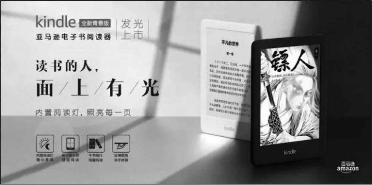 图1-10所示为Kindle新产品文案《读书的人,面上有光》。该文案的字面意思是说读书的人会散发魅力,但同时也可以理解由于Kindle新产品内置了阅读灯,因此用其阅读的人会被照亮面庞。短短的一句话却蕴含着十分丰富的含义,让人不禁回味良久,可以说是言简义丰的典范了。
