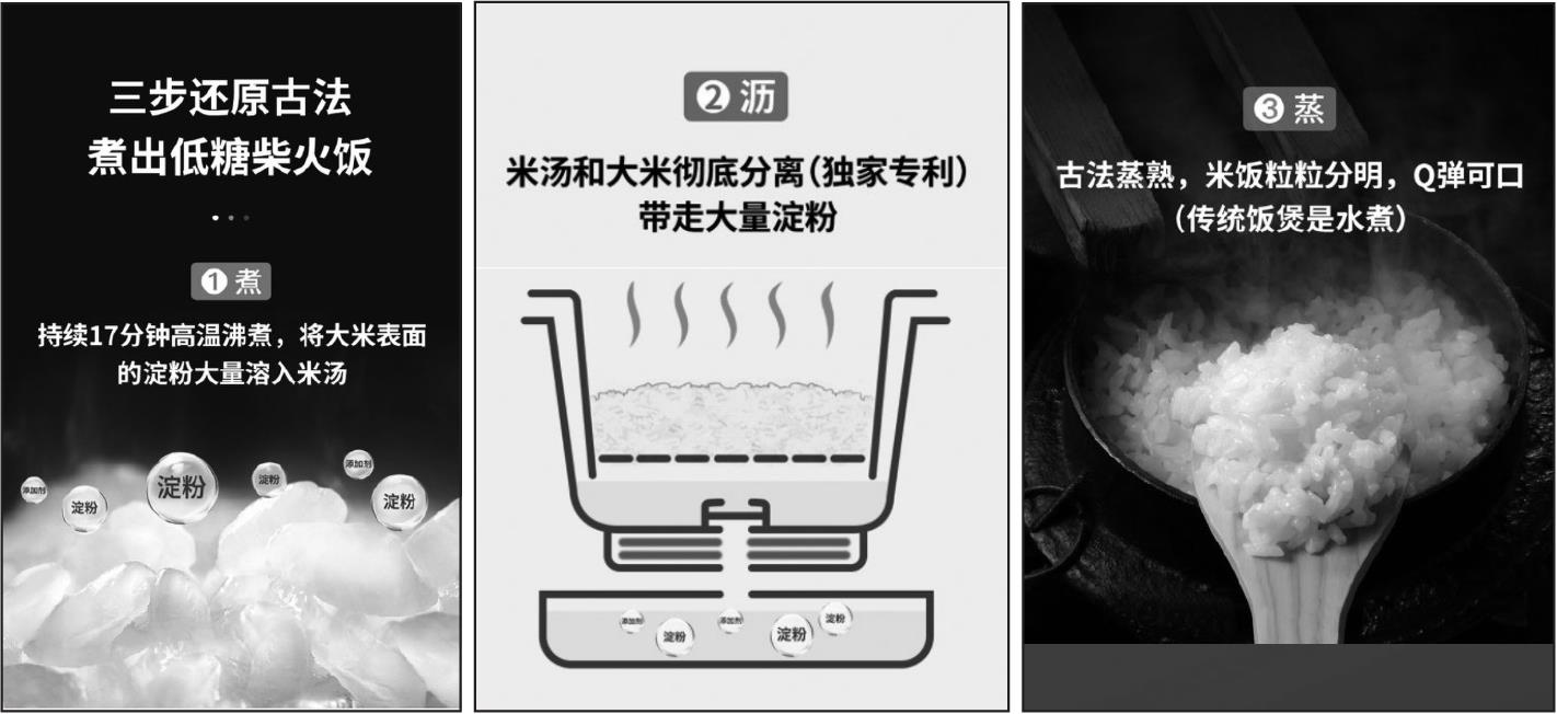 图1-3所示为某款低糖电饭煲产品详情页的功能介绍。文案中并没有用专业术语介绍电饭煲能煮出低糖米饭的原理,而是通过“煮”“沥”“蒸”等简单易懂的表述来说明电饭煲降糖的原理。