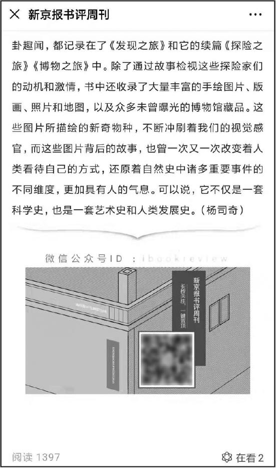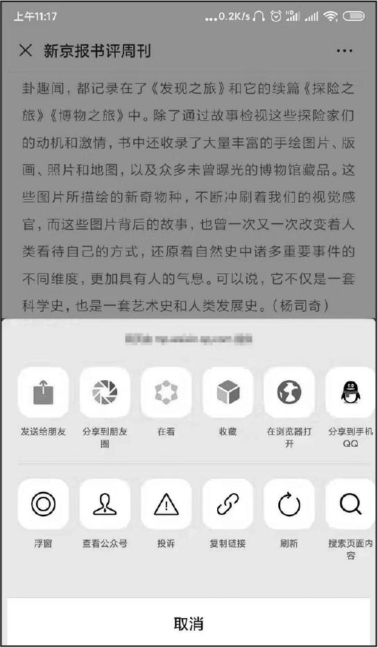 以微信公众号文案为例,一般情况下,受众可以通过扫描文末的二维码关注该公众号或其他推广的微信公众号。图1-1所示为“新京报书评周刊”微信公众号推送的一篇文章中附加的二维码。长按该图片后,点击弹出的“识别图中二维码”选项,就可关注该公众号。除此之外,受众还可点击文章右上方的“横三点”的标志,即弹出图1-2所示的页面,然后可以按照自己的需求将其分享给朋友。