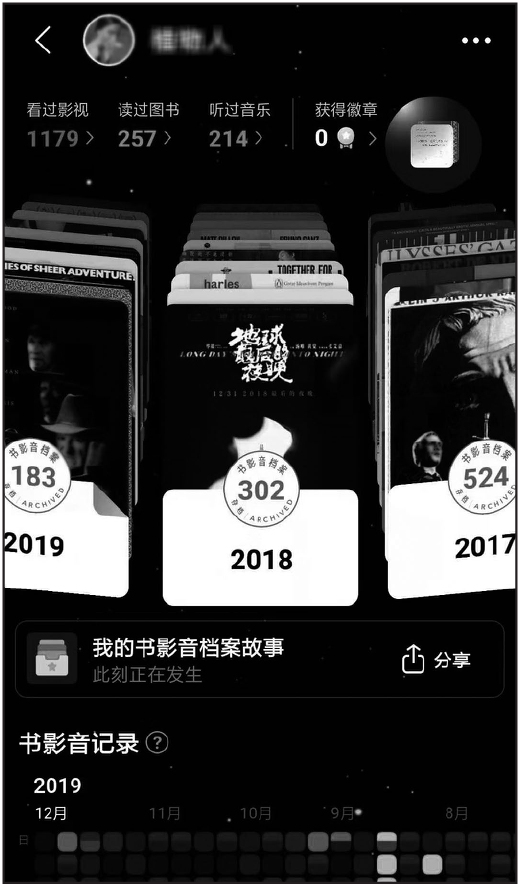 什么是社交货币呢?就像人们使用货币能买到商品一样,使用社交货币人们能够“买到”亲朋好友对自己的积极的印象。社交货币动机就是指受众希望通过分享优质内容获得大量的社交货币的动机,如分享古典文学方面的知识可以彰显自己的文化素养,发布精致自拍可以展示自己的良好形象等。成功刺激受众产生社交货币动机是许多文案得以广泛传播的原因之一,如输入姓名即生成随机的测试结果的H5文案、讲解专业知识的微信公众号文案、豆瓣App用户年度书影音数据盘点等。图1-12所示为豆瓣App用户年度书影音数据盘点。