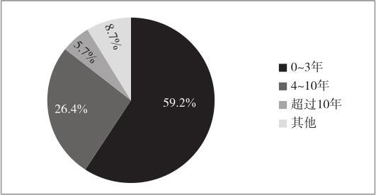 其实,数字经济的魅力并非因为此次疫情的爆发才被认识到。《2019年中国数字企业白皮书》中的调研结果显示,截至2019年,数字化转型0~3年的企业占59.2%,数字化转型4~10年的企业占26.4%,数字化转型超过10年的企业占5.7%,如图1-2所示。