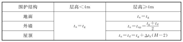 对于层高小于4m的房间,冬季室内计算温度即取室内设计温度。对于层高大于4m的房间,确定冬季室内计算温度时尚应考虑室内温度梯度的影响,地面处、屋顶和天窗处、外墙外窗及门处分别采用不同的温度。对于不同性质和高度的建筑物,室内温度梯度值与很多因素相关,如供暖方式、工艺设备布置及散热量大小等,难以在规范中给出普遍适用的数据,设计时需根据具体情况确定。