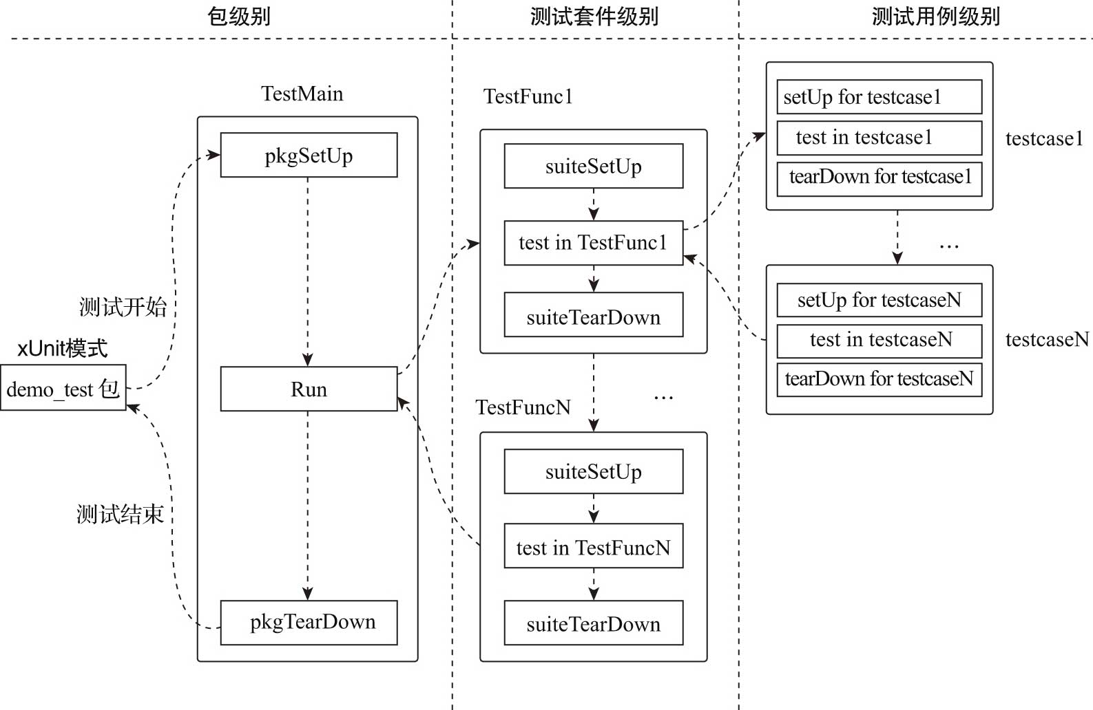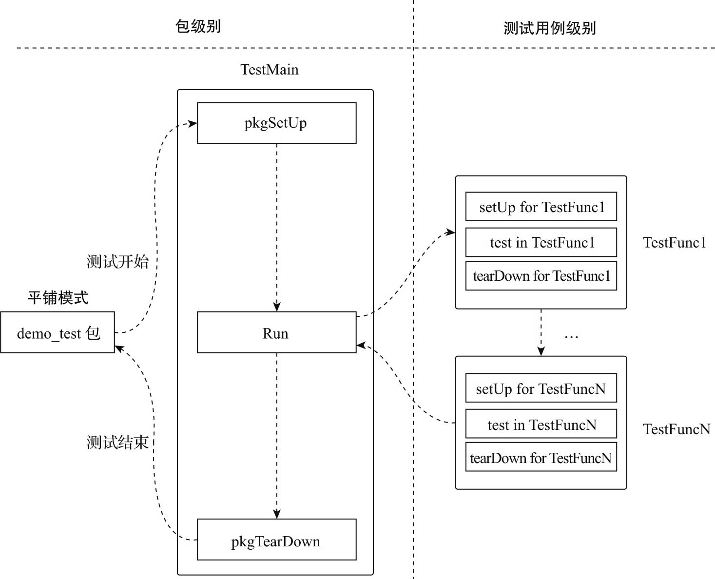 上面的示例在运行每个测试函数TestXxx时,都会先通过setUp函数建立测试固件,并在defer函数中注册测试固件的销毁函数,以保证在每个TestXxx执行完毕时为之建立的测试固件会被销毁,使得各个测试函数之间的测试执行互不干扰。