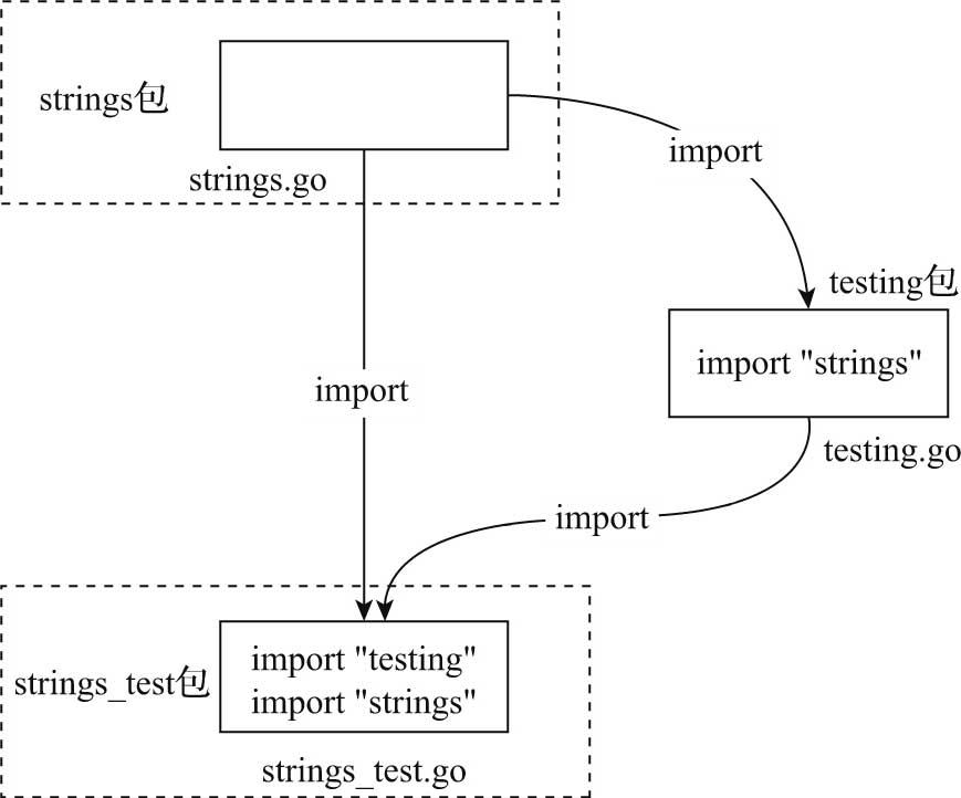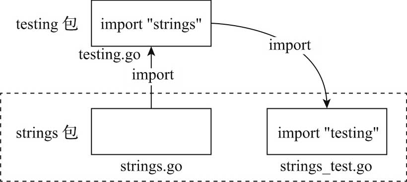 从图40-3中我们看到,采用包外测试的strings包将测试代码放入strings_test包下面,strings_test包既引用了被测试包strings,又引用了testing包,这样一来原先采用包内测试的strings包与testing包的循环引用被轻易地“解”开了。