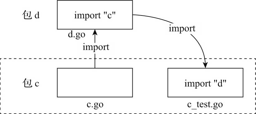 从图40-1中我们看到,对 包c 进行测试的代码(c_test.go)采用了包内测试的方法,其测试代码位于 包c 下面,测试代码导入并引用了 包d ,而 包d 本身却导入并引用了 包c ,这种包循环引用是Go编译器所不允许的。