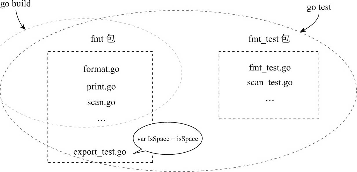 我们可以用图40-4来直观展示export_test.go这个后门在不同阶段的角色(以fmt包为例)。