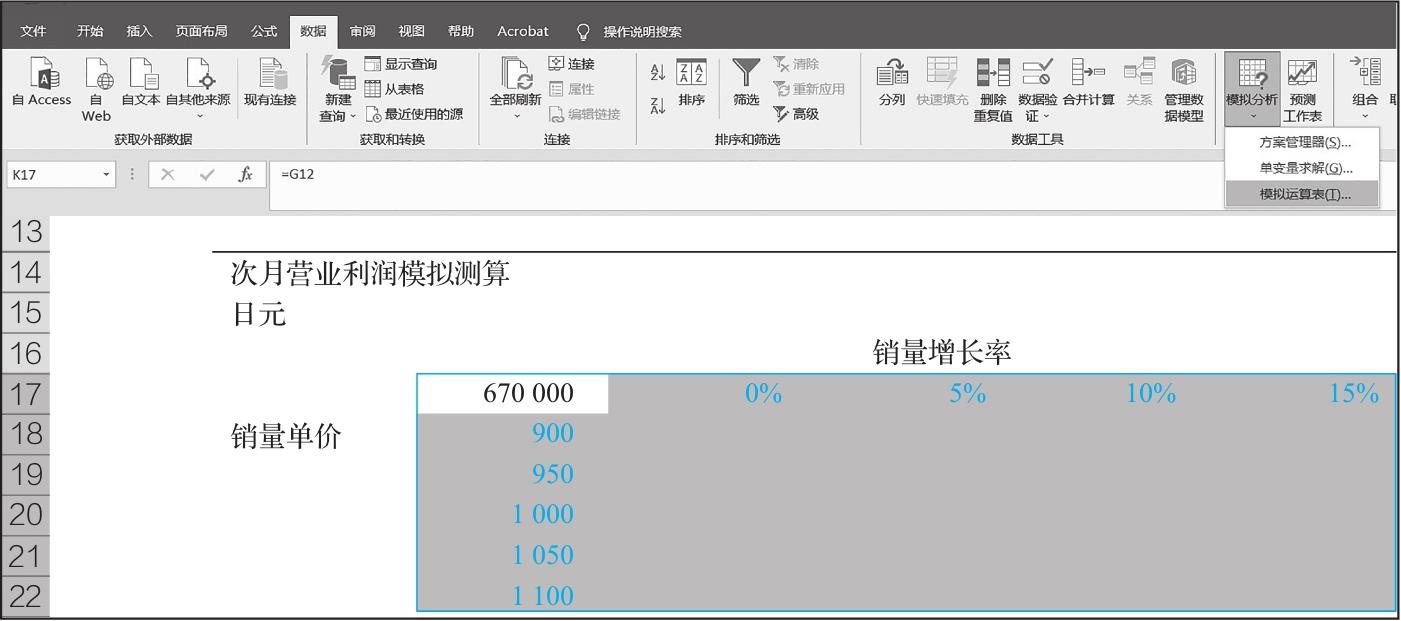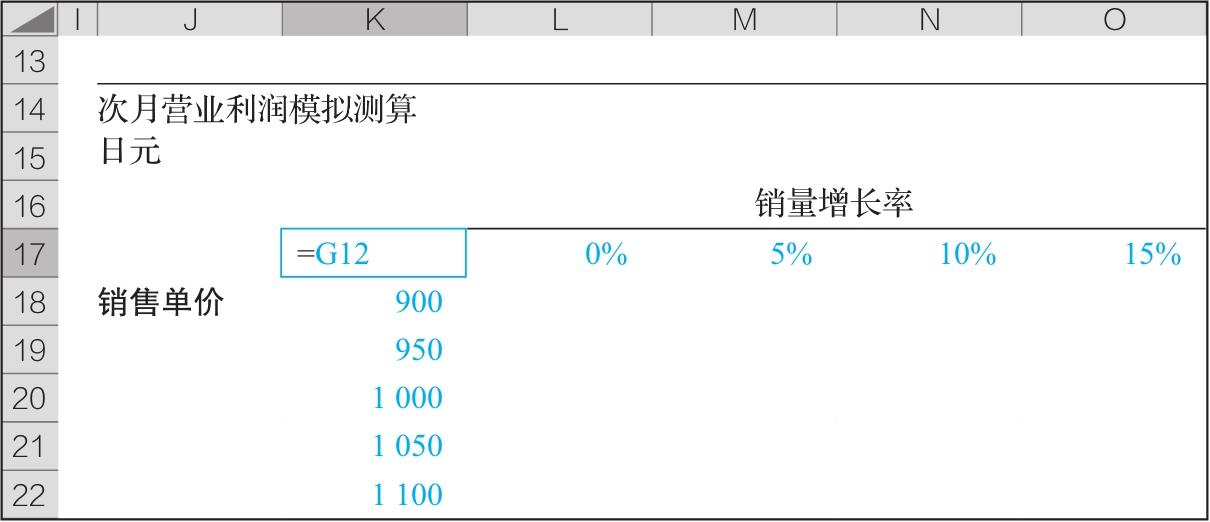 接下来,在敏感性分析表的左上区域(单元格K17)(见图2-18)引用次月利润(单元格G12)(见图2-19)。这是“模拟运算表”的使用规则,即敏感性分析表的左上单元格要引用我们想要模拟求解(次月利润)的单元格。