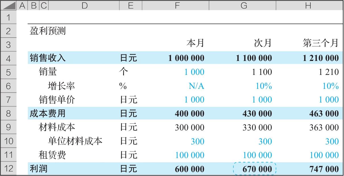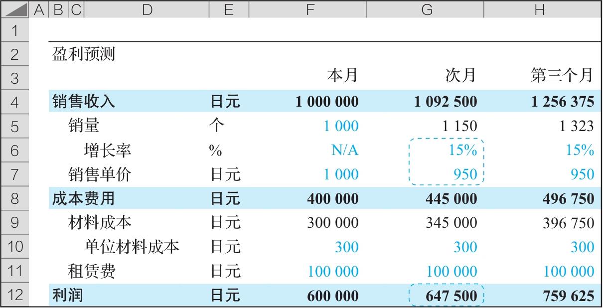 图2-14 原盈利预测模型(使用“单变量求解”后,数据改变了)
