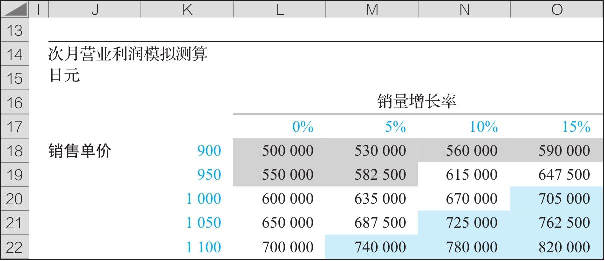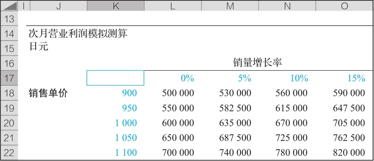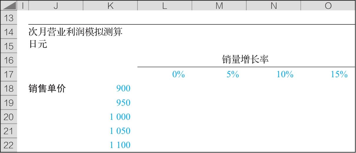首先,纵轴单元格中输入销售单价,横轴单元格中输入销量增长率。原始数据设置为彩色(见图2-17)。