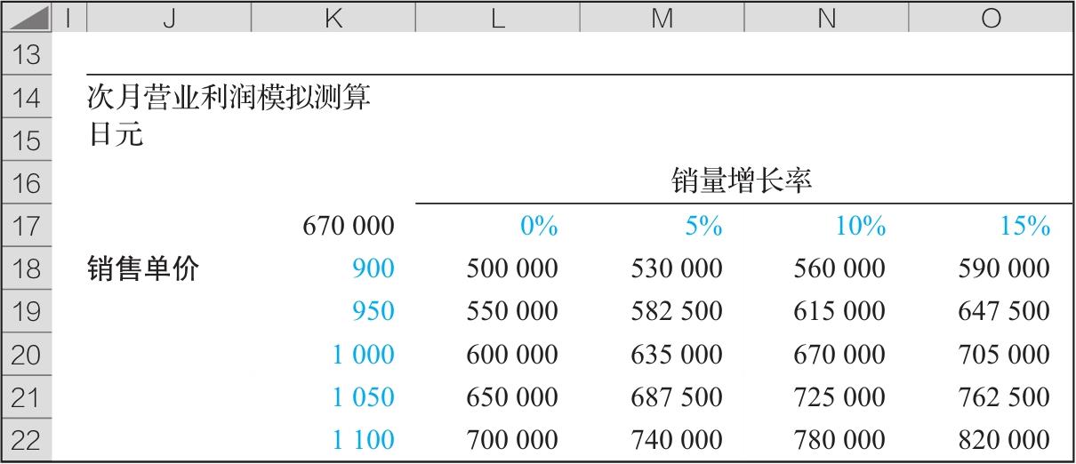 “原来利润会减少啊。那如果销量增长率由15%继续上升到20%,利润情况如何?稍等一下,对我们公司来说,20%的销量增长率难度有些大,但销售单价维持1 000日元不变,销量增长率保持15%还是可行的吧?总之,你帮我把相关情况下的利润结果都计算一下吧。”