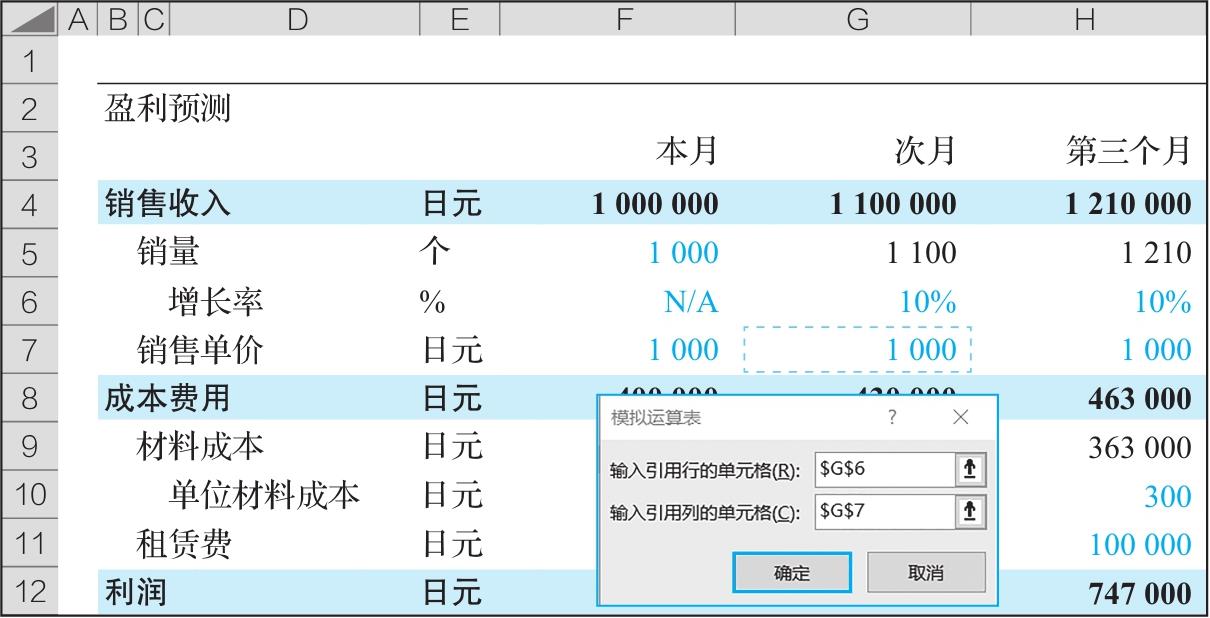 (2)输入引用列的单元格:列即“纵向排列”,本次模拟运算表中输入销售单价,引用的是次月销售单价(单元格G7)。