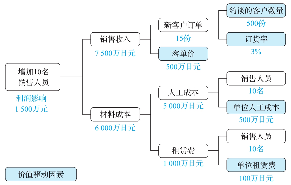 因此,我们需要厘清利润结构,明确增加10名销售人员分别引起的销售收入和成本费用变动情况,计算其对利润的影响。如图1-4所示,我们与上司逐个讨论并确定彩色框中的数据(价值驱动因素),能更精确地计算出利润变动结果。
