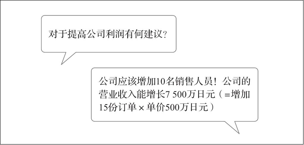 上司的批评理所当然,因为并无明确证据表明增加10名销售人员能增加15份订单,确定10名销售人员能约谈的客户数量、实现的客户订货率,以及商品销售单价能否高于500万日元等,要考虑大量因素。另外,如果增加了销售人员,人力成本也相应提高了,办公场地租赁费也可能增加。
