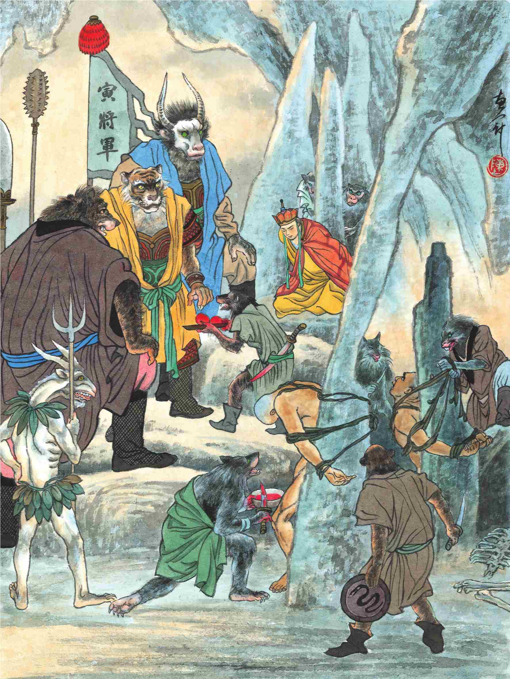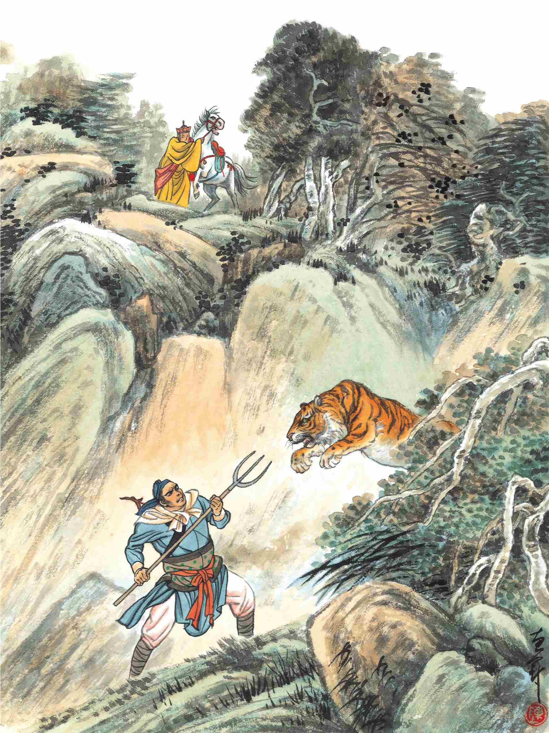 原来此人是山中猎户,名叫刘伯钦,绰号镇山太保,此日山中打猎,不期而遇三藏。伯钦欲带三藏去自己家中暂歇,过了山坡,又遇猛虎,吓得三藏瘫软在地,那镇山太保举起钢叉,与猛虎斗在一起。约有一个时辰,猛虎终被太保刺倒。