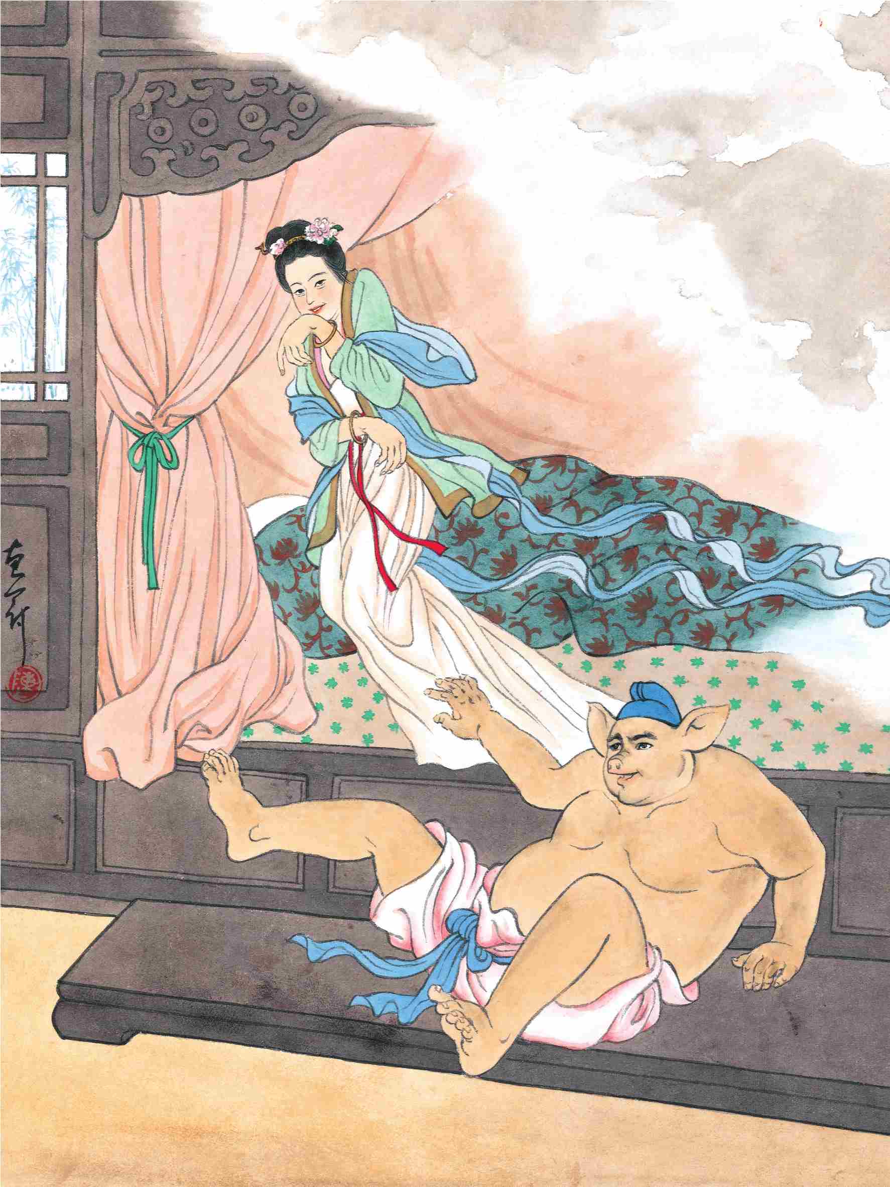 高太公见了师徒二人,告诉了他们这个女婿的由来,原来这高太公有三个女儿,分别叫香兰、玉兰、翠兰。两个大的女儿已经嫁人,只有这个小女翠兰,高太公想找一个上门女婿撑门抵户。不想三年前,来了一个汉子,说是福陵山上人家,姓猪,上无父母,下无兄弟,进门做了这高太公的女婿。这汉子进门时倒也勤快,耕田耕地,不用牛具,收割田禾,不用刀杖。只是有一件,有时会变嘴脸。初来时,是个黑胖汉,后来变成一个长嘴大耳朵的呆子,脑后有一溜鬃毛,身体粗糙怕人,头脸就像个猪的模样。饭量极大,一顿要吃三五斗米饭,早间点心,也得百十个烧饼才够。幸亏他还吃斋,如果吃荤,我高家庄的家业田产早被他吃光了。