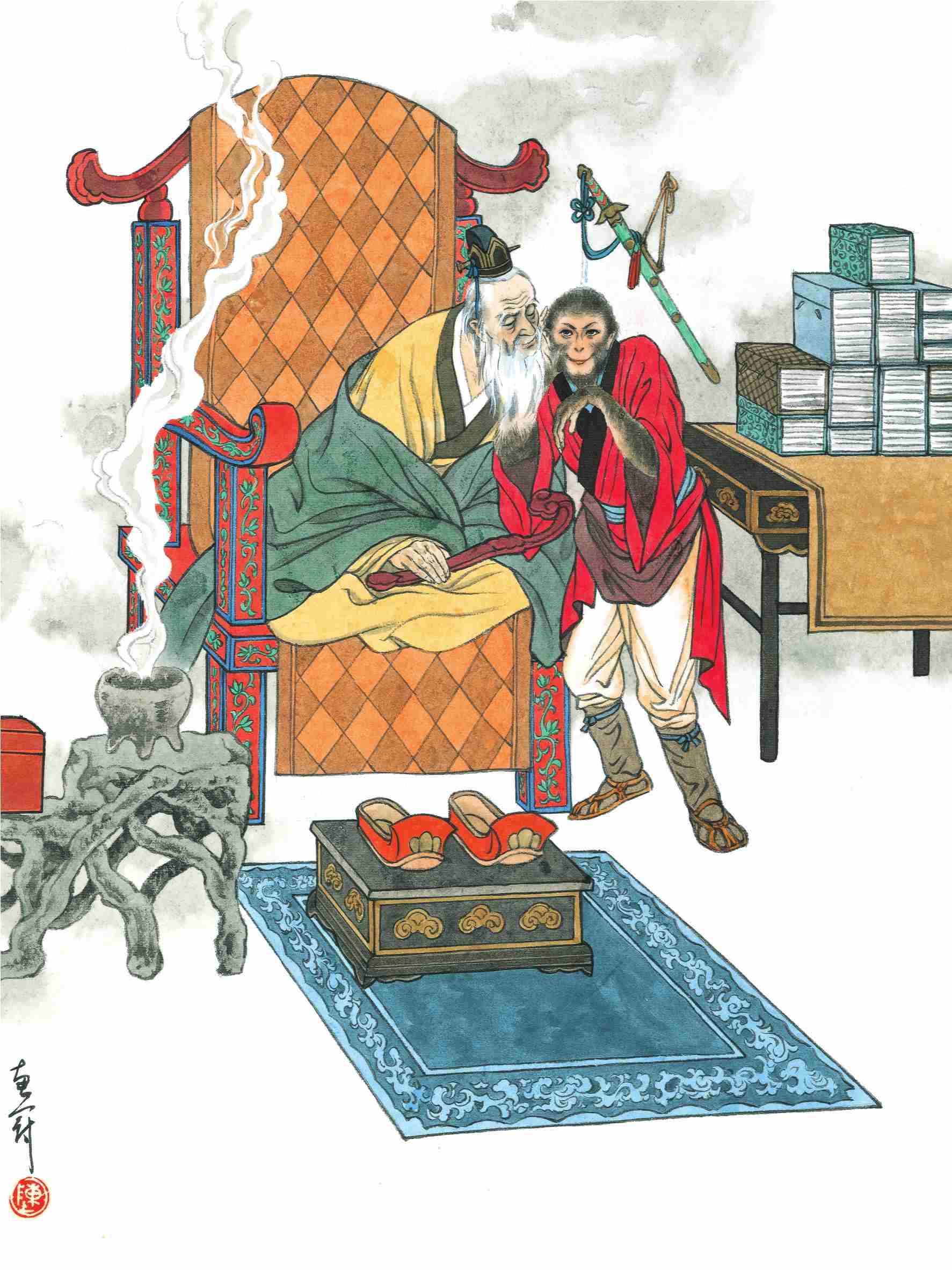 祖师最后忍不住火了,咄的一声,跳下高台,手持戒尺,指定悟空说:“你这猢狲!这也不学,那也不学,你想要怎样?”