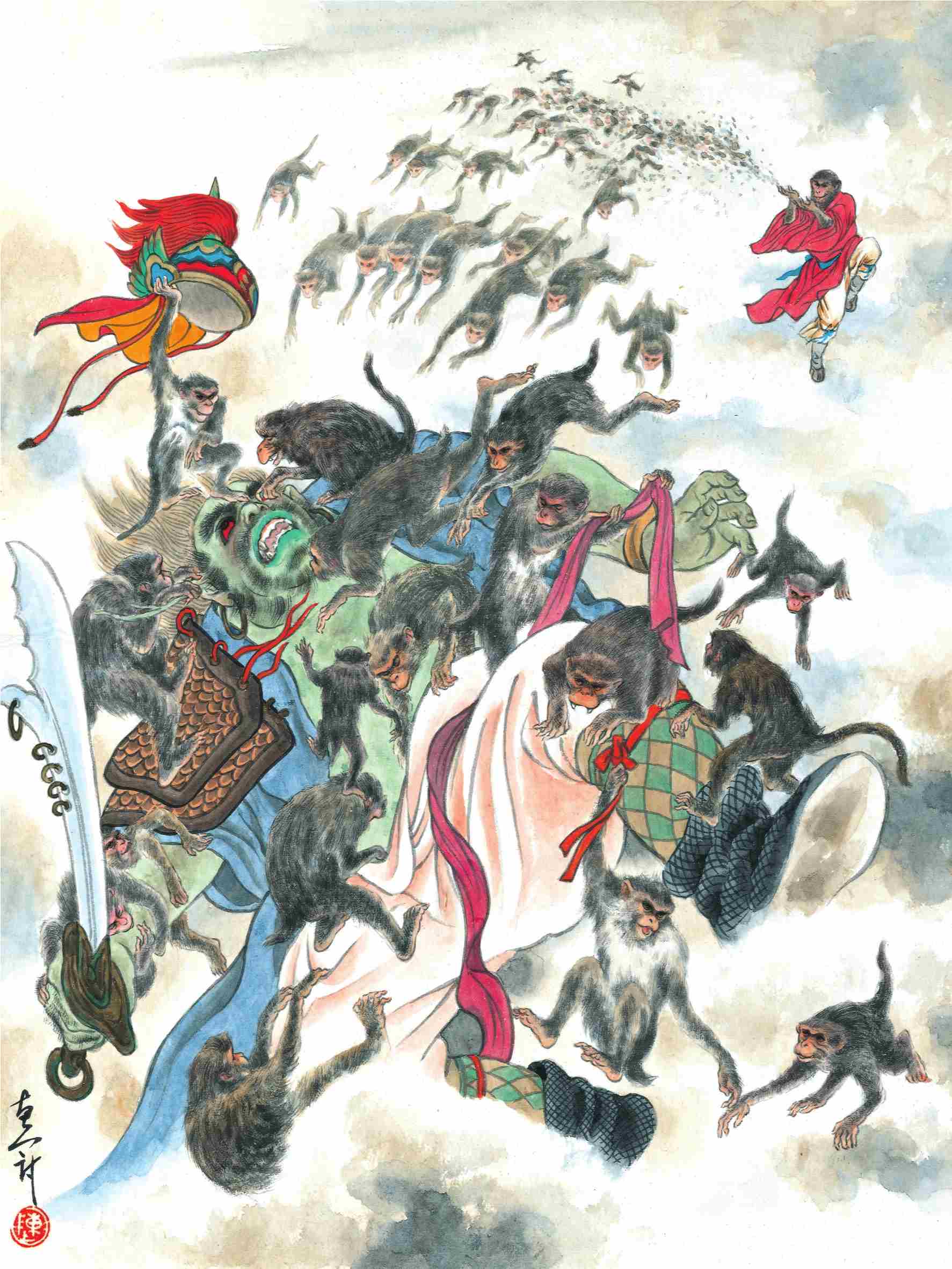 悟空随即找到那妖怪藏身的坎源山水脏洞,那魔王绰刀来战悟空。悟空牛刀小试,拨出一把毫毛,变出二三百个小猴,抱的抱,扯的扯,钻裆的钻裆,扳脚的扳脚,踢打挦毛,抠眼睛,捻鼻子,将那魔王拽翻,悟空上去夺了他的刀,照顶门一刀,将那魔王砍成两段。然后率领众猴杀进洞中,把那大小妖精,尽数剿灭,随后将那毫毛一抖,收上身来。那些被魔王掳去的小猴,见到猴王,眼含热泪,个个欢喜。悟空念声咒语,驾阵狂风,将众猴带回了花果山。