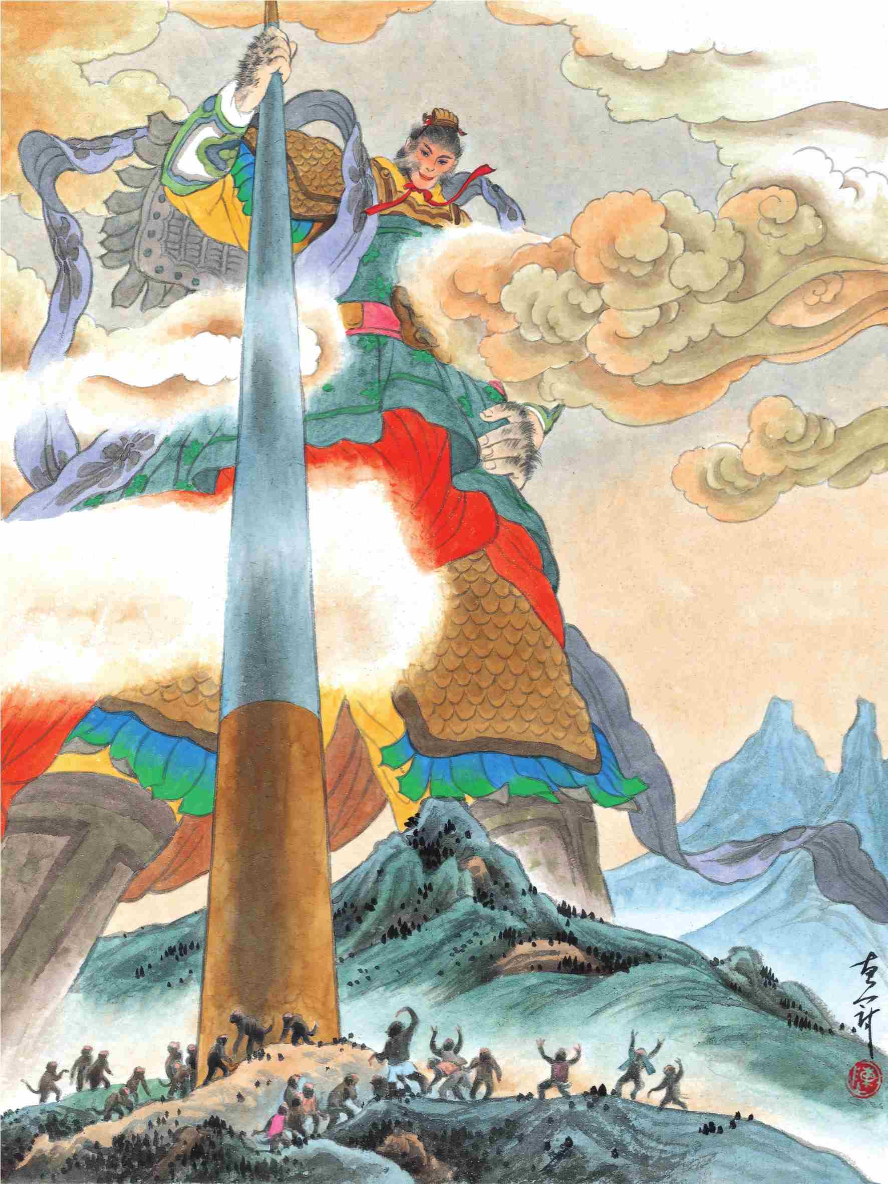悟空意犹未尽,又问老龙王索要披挂,老龙王推说没有,猴王说要拿这棒子跟老龙王比画比画,吓得老龙王赶紧把自己的另外三个兄弟召来,于是北海龙王敖顺奉上一双藕丝步云履,西海龙王敖闰送上一副锁子黄金甲,南海龙王敖钦心里虽然也有一万个不服,但害怕那金箍棒的威力,也送上一顶凤翅紫金冠。悟空将金箍棒缩小成针藏于耳中,披挂整齐,好不威风,得意洋洋地回花果山去了。这边四海龙王很是恼火,于是商议着上表玉帝,告孙悟空一状。