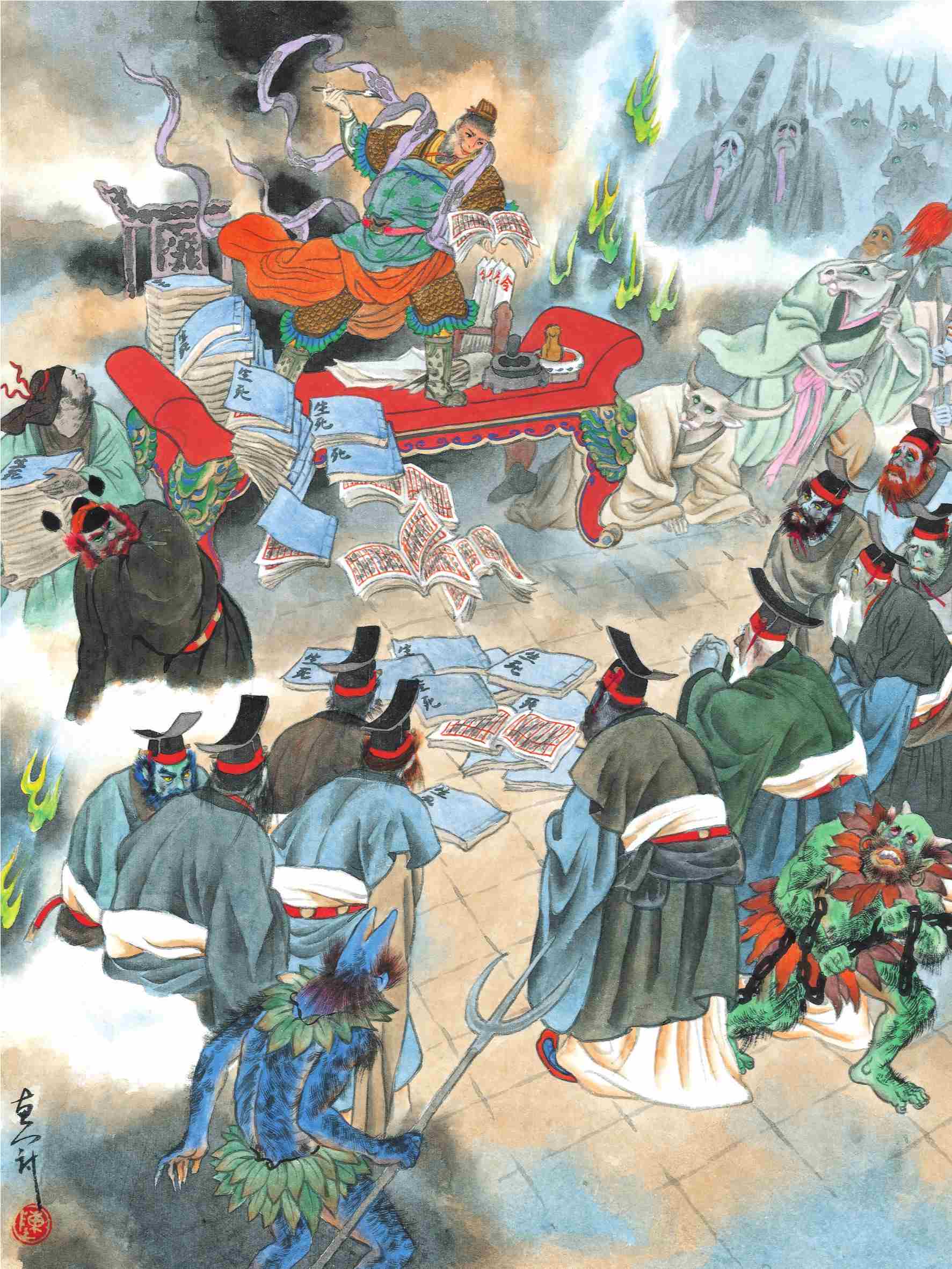 一天,悟空与其他六王喝酒,喝得酩酊大醉,梦中见到两人拿着一张批文,上面写着“孙悟空”三个大字,他们走到悟空身边,不容分说套上绳索就把他的魂灵带到了幽冥界。悟空顿然醒悟,连忙说道:“我已经修炼成仙,跳出三界外,不在五行中,阎王怎么还来勾我?”两个勾魂鬼只管拉拽着他走,悟空恼了,耳朵中扯出金箍棒晃一晃,把两个勾魂鬼打成肉酱,然后一路打入森罗殿,吓得十代冥王秦广王、楚江王、宋帝王、仵官王、阎罗王、平等王、泰山王、都市王、卞城王、转轮王赶紧取出生死簿来见孙悟空。悟空把自己名字一笔勾销,把那猴属之类但有名字者,统统一笔勾之,然后打出幽冥界,绊着一个草圪垯,摔了一跤才醒来,原来是南柯一梦。
