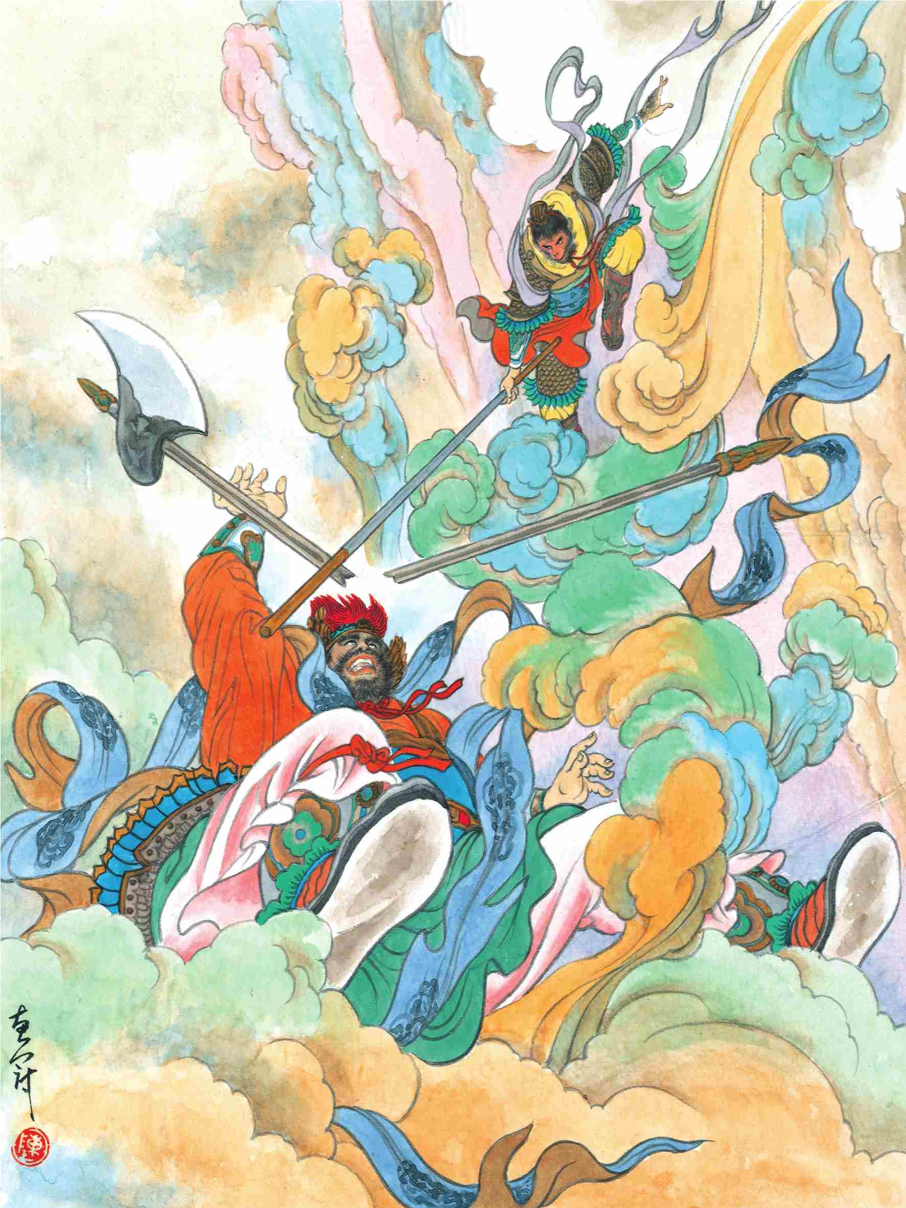 李天王听说大怒,本想斩了巨灵神这个废物,被哪吒三太子劝住,哪吒自告奋勇来战悟空。