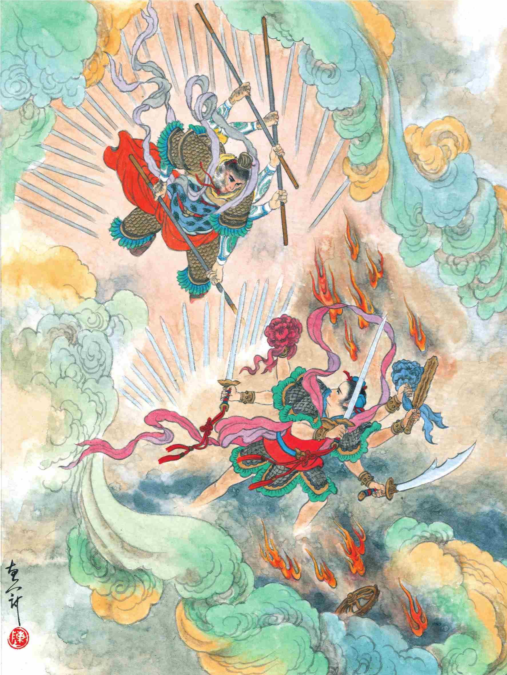 悟空见哪吒变成了三头六臂,什么斩妖剑、砍妖刀、缚妖索、降妖杵、绣球儿、风火轮儿,丫丫叉叉,纷纷扑面打来,确实有些手段。悟空也变成三头六臂,六只手拿着三条棒,与哪吒战在一处,竟然打了三十几个回合没分胜败。悟空急中生智,拔出一根毫毛,变成本相,与哪吒对战,真身却一纵赶到哪吒脑后,照着他左臂一棒打去,哪吒躲闪不及,被悟空着了一棒,急忙收了六件兵器,负痛而逃。