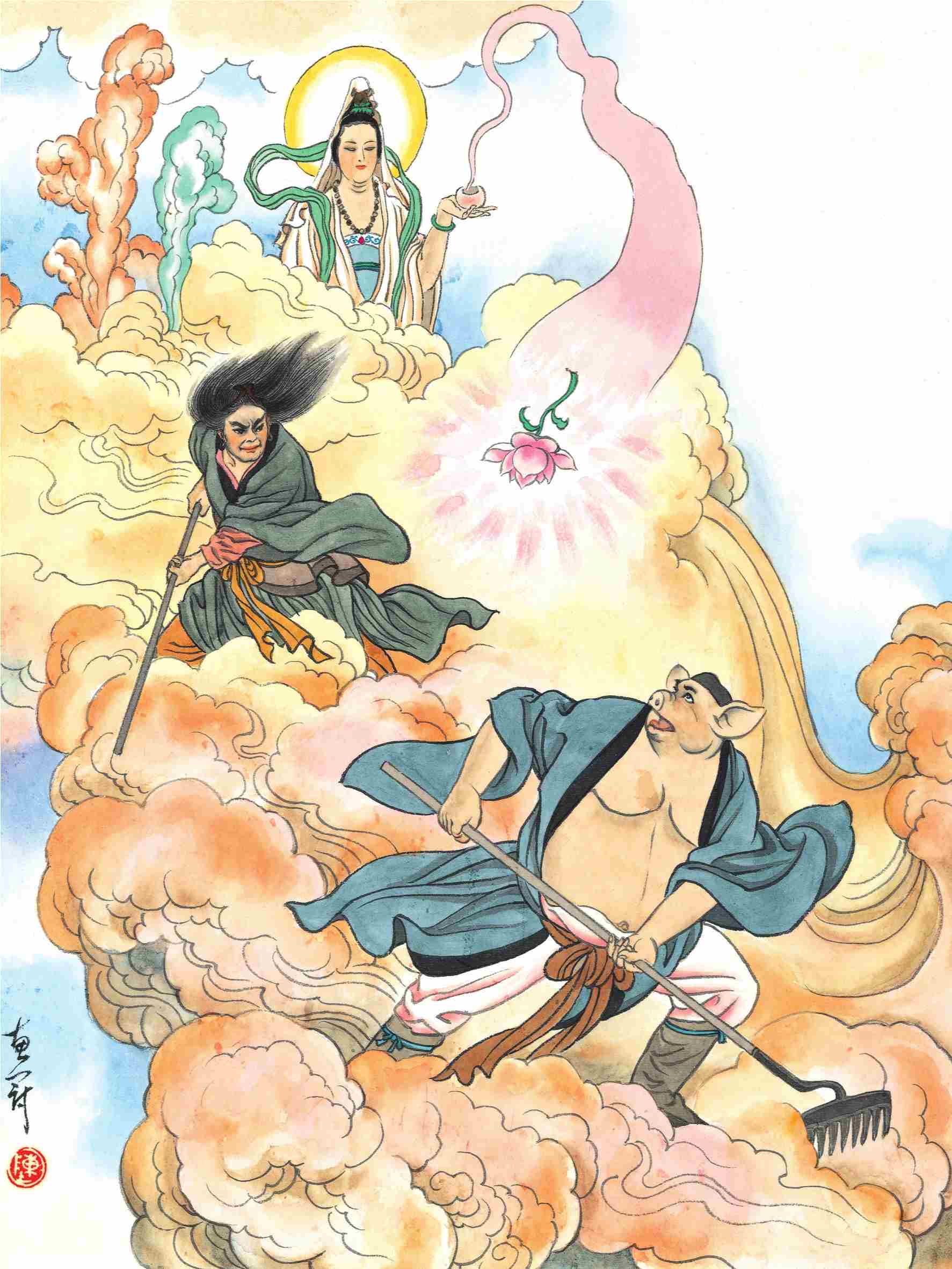 菩萨说:“你要肯皈依正果,自然有养身之处,世上有五谷,都能充饥,何必要吃人呢?我领了佛旨去东土寻找取经人,你在这等着他,做他的徒弟,同去西天,将功折罪。”那猪怪满嘴答应,菩萨于是给他也取了一个法名,叫作“猪悟能”。那悟能领命归真,持斋把素,断绝了五荤三厌,专候那取经人。