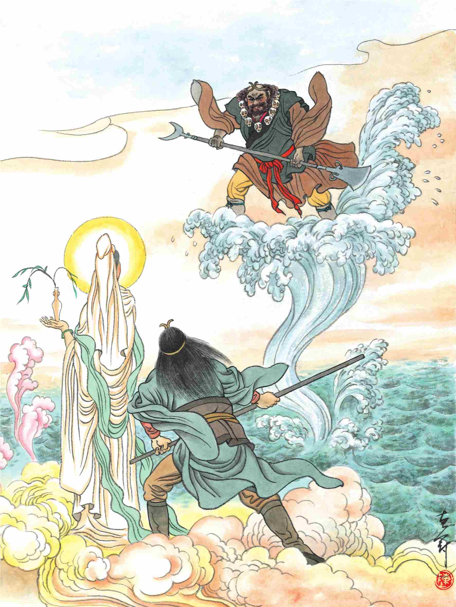 观音辞别如来,带着惠岸行者离开灵山,向东土而来。走到流沙河界,河中突然跳出一个妖魔,长得青面獠牙,红发蓬松,手中拿着一根宝杖,上来就来捉菩萨,却被惠岸挡住,一通儿厮杀,这两个战了数十个回合,不分胜负。那怪物架住了惠岸行者的铁棒,寻问来历。恵岸告诉妖怪:“我是南海观音弟子木叉惠岸行者,保师父去东土寻找取经人,你这妖怪竟敢挡路?”