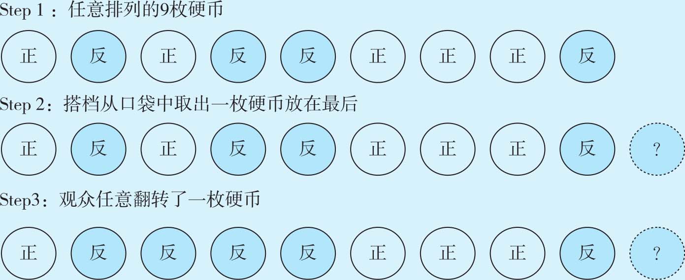 图1-6展示了一个具体实例中魔术师与搭档配合猜硬币的全过程,在第二步中,搭档在9枚硬币之后又放置了一枚硬币,这样魔术师就可以轻而易举地猜出在第三步中观众翻转了硬币,所以,问题的关键就出在最后这枚硬币上。最后这枚硬币究竟要如何放置呢?是正面朝上还是反面朝上呢?这里面有什么讲究没有?