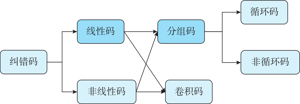 一般系统中常用的差错控制码主要是检错码和纠错码。检错码与纠错码的不同之处在于,检错码只能根据接收到码的内容得知该码是否在传输或存储中发生了错误,并不能定位该错误发生在哪一(几)位上,因此,它是一种比较低端的差错控制码。我们前面讲到的奇偶校验码就是一种最常用的检错码。而纠错码不但可以检测出该码是否在传输或存储中发生了错误,而且还能通过计算得出错误发生的位置,并加以纠正。因此,纠错码在实际使用中较为广泛,且实用性更强。在分类上,纠错码可以按照不同的方式进行分类。如图1-7所示,其中使用较多的纠错码是线性分组码。目前较为常见的线性分组码主要有海明码、CRC码(循环冗余校验码)、BCH码、RS码(里德-索洛蒙码)、戈帕码等。这些纠错产生的理论不同,编码和译码的方法也不同,因此,纠错能力和编码性能也不尽相同。