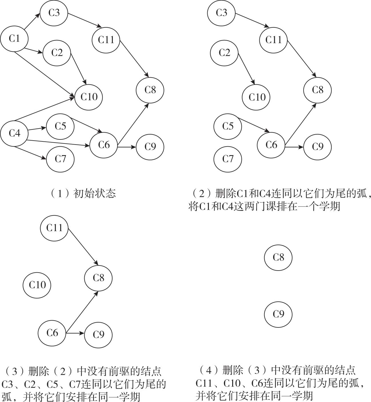 按照上述的步骤,从AOV网中不断删除结点和有向弧,并将每次删除的结点排成同一学期的课程。整个过程如图1-19所示。