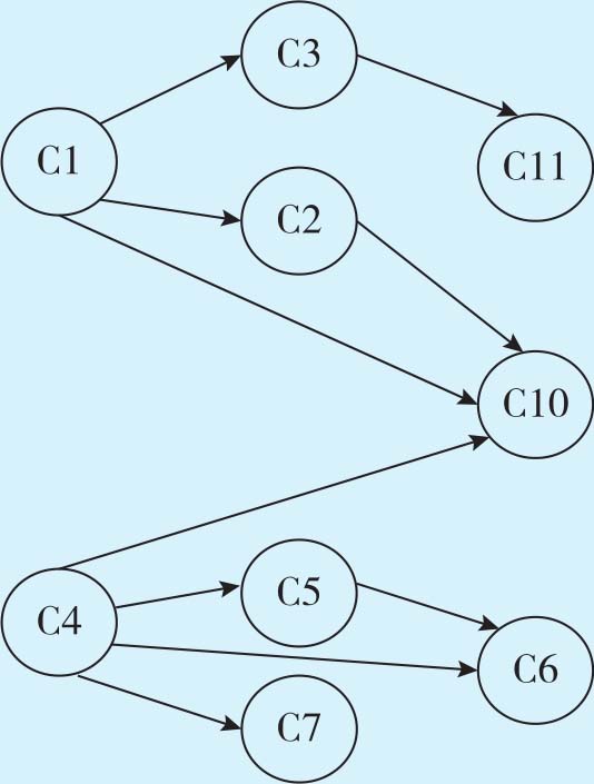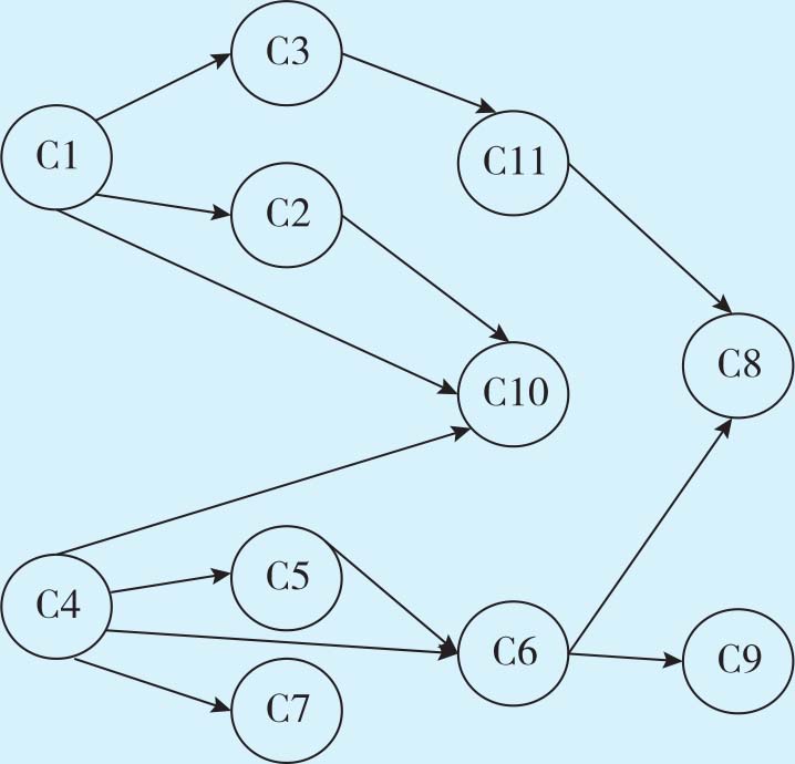最后找出仅以C1、C4、C3、C2、C5、C7、C11、C10、C6其中一个或多个结点为先修课的课程作为新的结点,并将其与前面的结点用有向弧连接。从题目中可知,C8的先修课程为C6和C11,C9的先修课程为C6。图1-18为必修课AOV网构造-4。