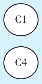 如何构造全部必修课程的AOV网呢?我们要以没有先修课的课程作为起点开始构造。从题目中可知,只有C1和C4没有先修课,我们就以这两门课程作为起点开始构造整个AOV网。图1-15为必修课AOV网构造-1。