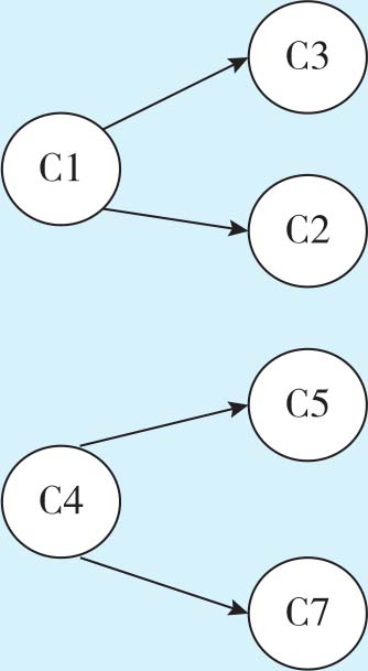 接着找出仅以C1或者C4为先修课的课程作为新的结点,并将其与C1、C4通过有向弧连接。从题目中可知C2、C3、C5、C7仅以C1或C4为先修课,C10虽然也以C1和C4为先修课,但是它也以C2为先修课,因此不符合要求。图1-16为必修课AOV网构造-2。