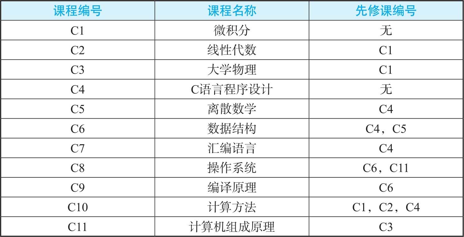 我们以计算机专业的排课方案为例进行讨论。计算机专业的学生必须在大学四年期间学习一系列课程,这些课程有些是基础课程,有些是专业课程,而这些课程之间可能存在着一定的先行后续的关系,也就是说,有些课程作为基础知识必须先修,有些课程需要学过其他必修课之后才能进行学习。表1-3中列出了计算机专业必修的一些课程以及它们之间的先行后续关系。