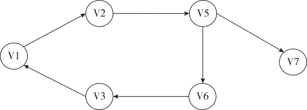 这里需要注意一点,在AOV网中是不能出现回环的,例如图1-20表示的有向图就不是AOV网,因为在AOV网中有向边(弧)表示的是活动(图中的结点)之间的先后关系。如果存在回环就意味着某个活动要以自己为先决条件。图中V1的先决条件是V3,V3的先决条件是V6……最终V2的先决条件是V1,这样V1就以自己为先决条件,也就是说V1的发生必须在V1发生之后,这样看上去确实很荒谬。所以,我们在使用AOV网分析问题时要注意这一点。