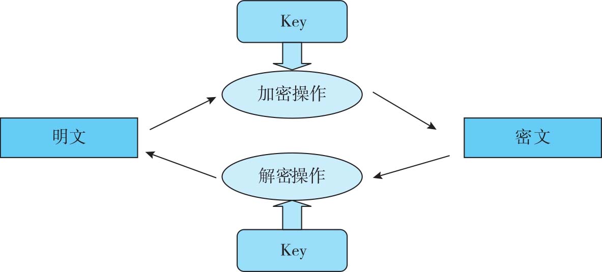 对称密码体制是一种经典的加密体制策略。加密方A和解密方B共享一个密钥Key。加密方A使用密钥Key对明文进行加密操作生成密文,解密方B使用同样的密钥Key对密文进行解密操作生成明文。整个过程如图1-3所示。