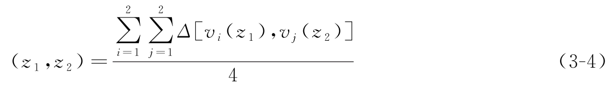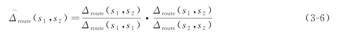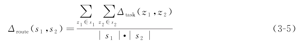 因此 Δ route ( s 1 , s 2 )是任务 z 1 和 z 2 间所有的任务对 s 1 和 s 2 ( s 1 ∈ z 1 , s 2 ∈ z 2 )间的平均距离。再把 Δ route ( s 1 , s 2 )根据 Δ route ( s 1 , s 1 )和 Δ route ( s 2 , s 2 )进行规范化,最终得到任意路由 s 1 和 s 2 间的距离为: