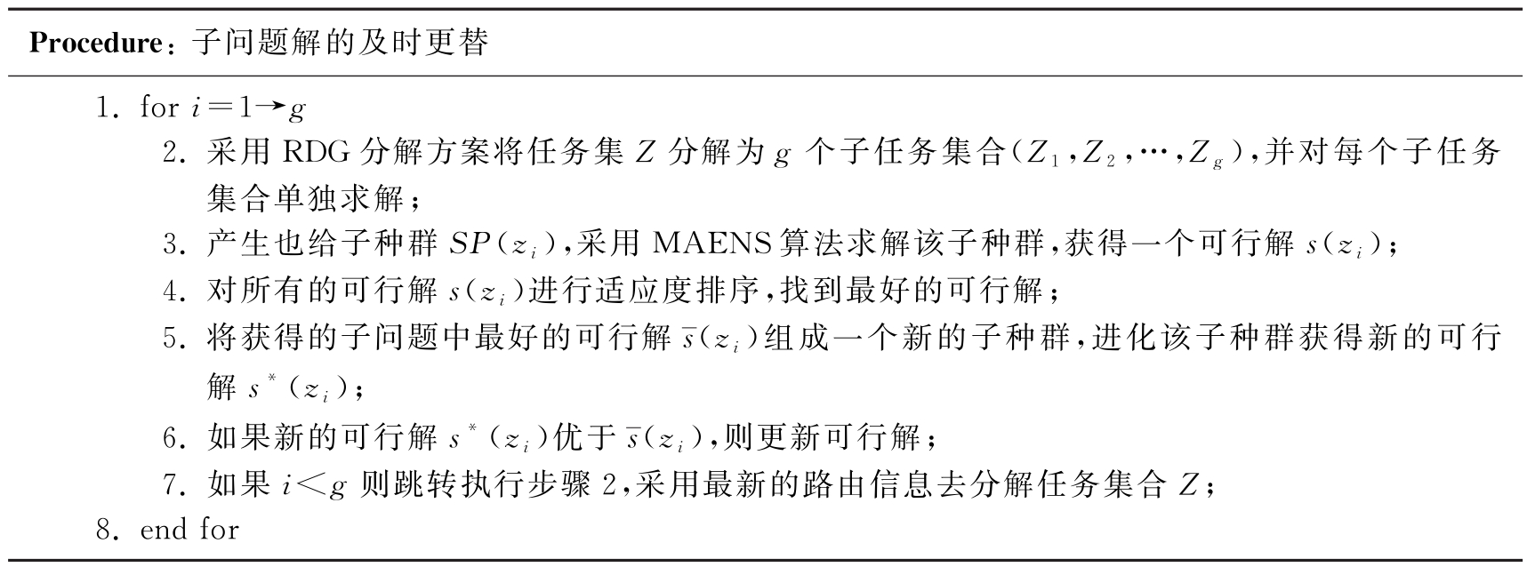 在IRDG-MAENS算法中,首先根据RDG算法将大规模的问题进行分解,再对分解后得到的子问题单独求其最优解。在获得子问题最优解后立即用较好的解进行更替并通过邻域共享参与当前子代问题的求解。这不仅能够加快算法的收敛速度,还及时更替每个子问题较好的解,参与该循环和其他子问题的求解,这种方法更利于邻域共享和获得潜在的更好的解。表3.5是更加详细的子问题解的及时更替过程。