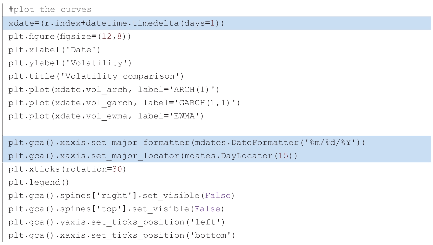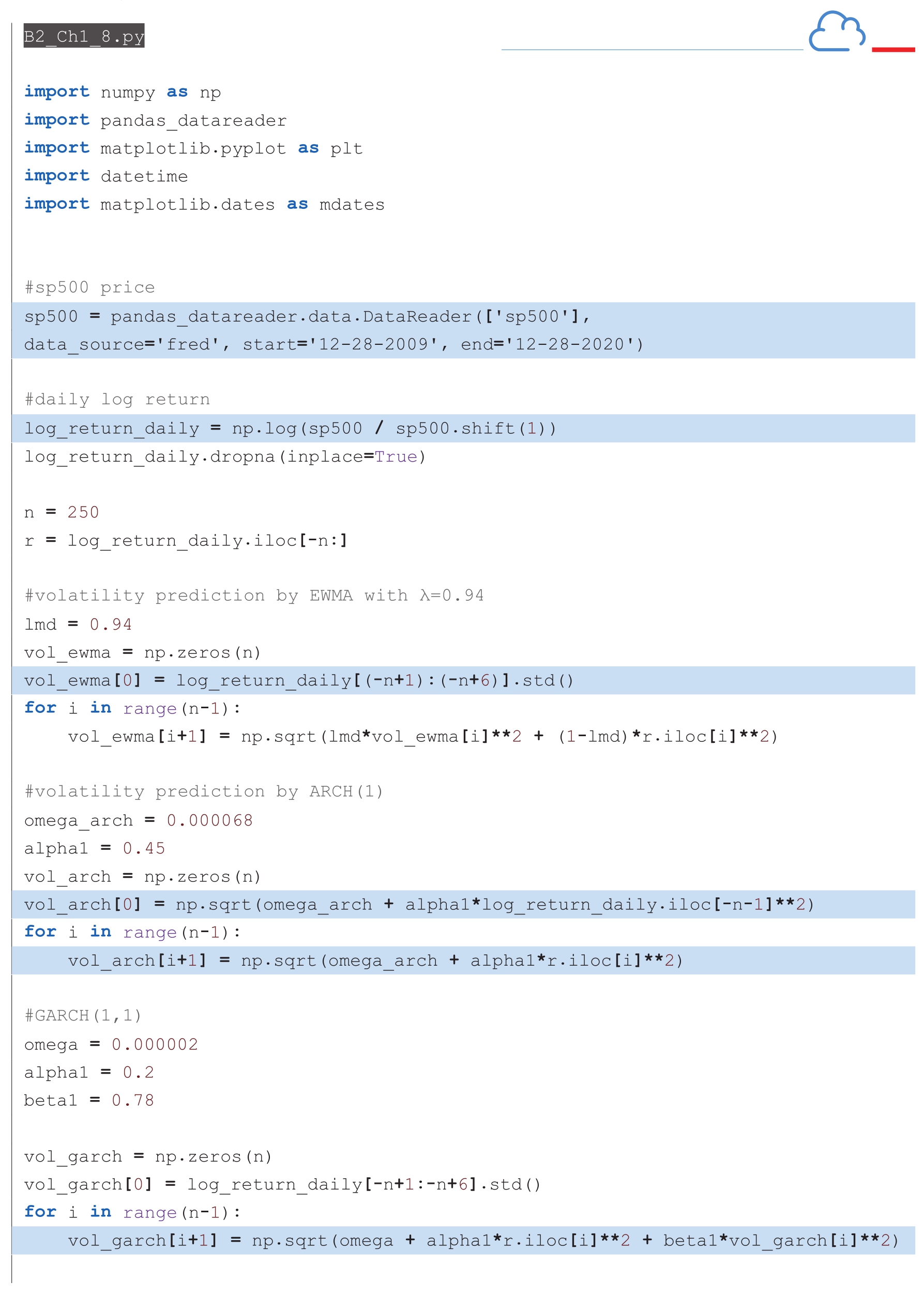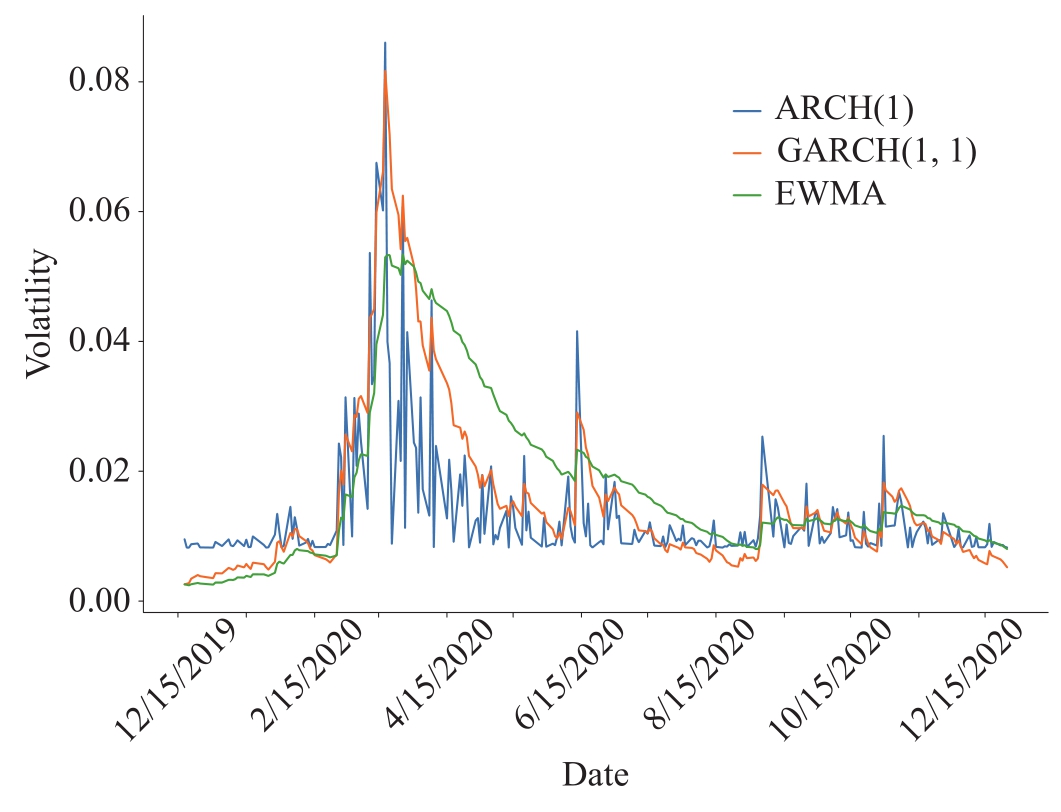 下面代码继续使用标准普尔的历史数据,分别利用上面三个模型估算了2009年12月28日到2020年12月28日的波动率。