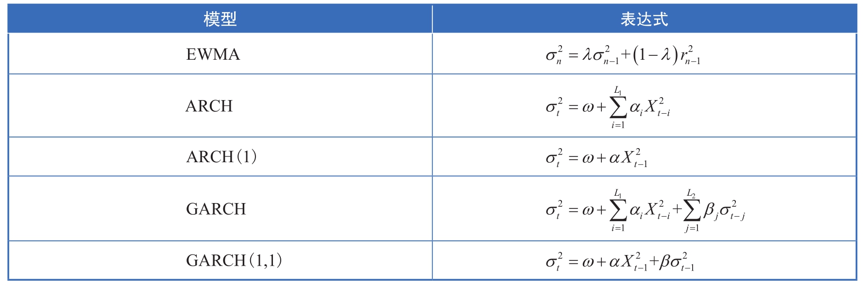 表1-1 EWMA、ARCH与GARCH数学表达式对比