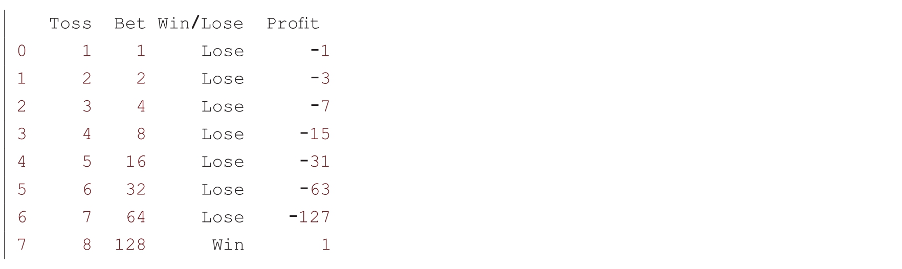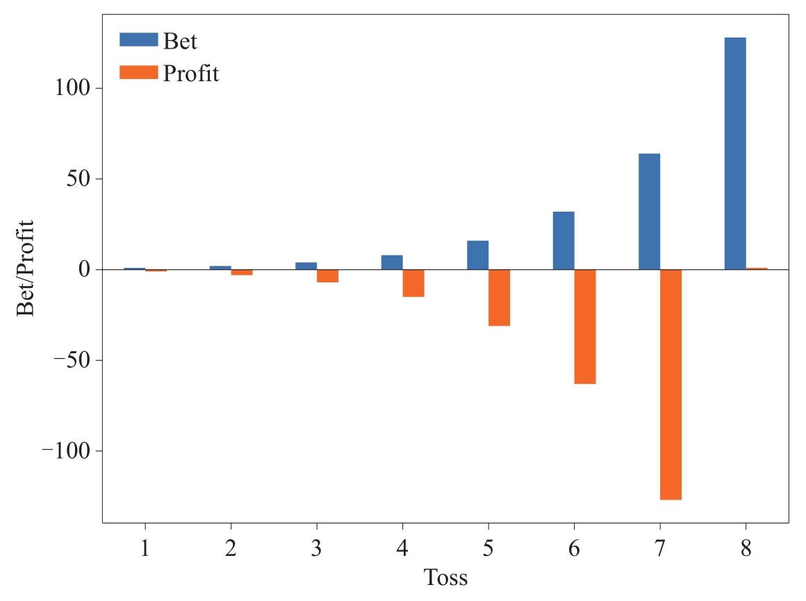 从结果可知,前七轮共输127美元,但坚持马丁格尔策略进行投注,在第八轮第一次赢时,不但赚回前七轮的所有亏损,并且获利1美元,其图形展示如图2-8所示。