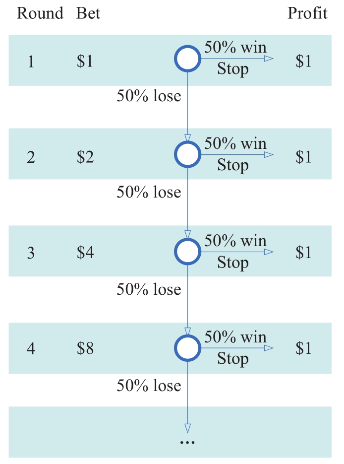 马丁格尔最初是一种在赌输后加倍下赌注的赌博策略,起源于18世纪的法国,并迅速风靡欧洲,号称“稳赚不赔”。比如一个抛硬币的赌盘,自始到终只压某一面,如果输钱,就将输钱的金额加倍作为新赌注,继续压,一直到赢,而这每一次赢就可以将前面所有的亏损全部赢回并多赢第一次所压的金额。如图2-7所示,如果初始赌注为1美元,在一轮赢,则获得1美元,如果第一轮输,则第二轮加倍赌注为2美元,第二轮赢,则赢2美元,但需要减去第一轮输掉的1美元,所以净获利仍为1美元;如果第二轮仍然输,则输2美元,在第三轮赌注加倍为4美元;如果第三轮赢,则赢4美元,减去第一轮输的1美元和第二轮输的2美元,净获得依旧为1美元;以此类推,可以知道,只要坚持这个策略投注,在第一次赢,就可挽回之前所有损失,并净赚最初的赌注1美元。