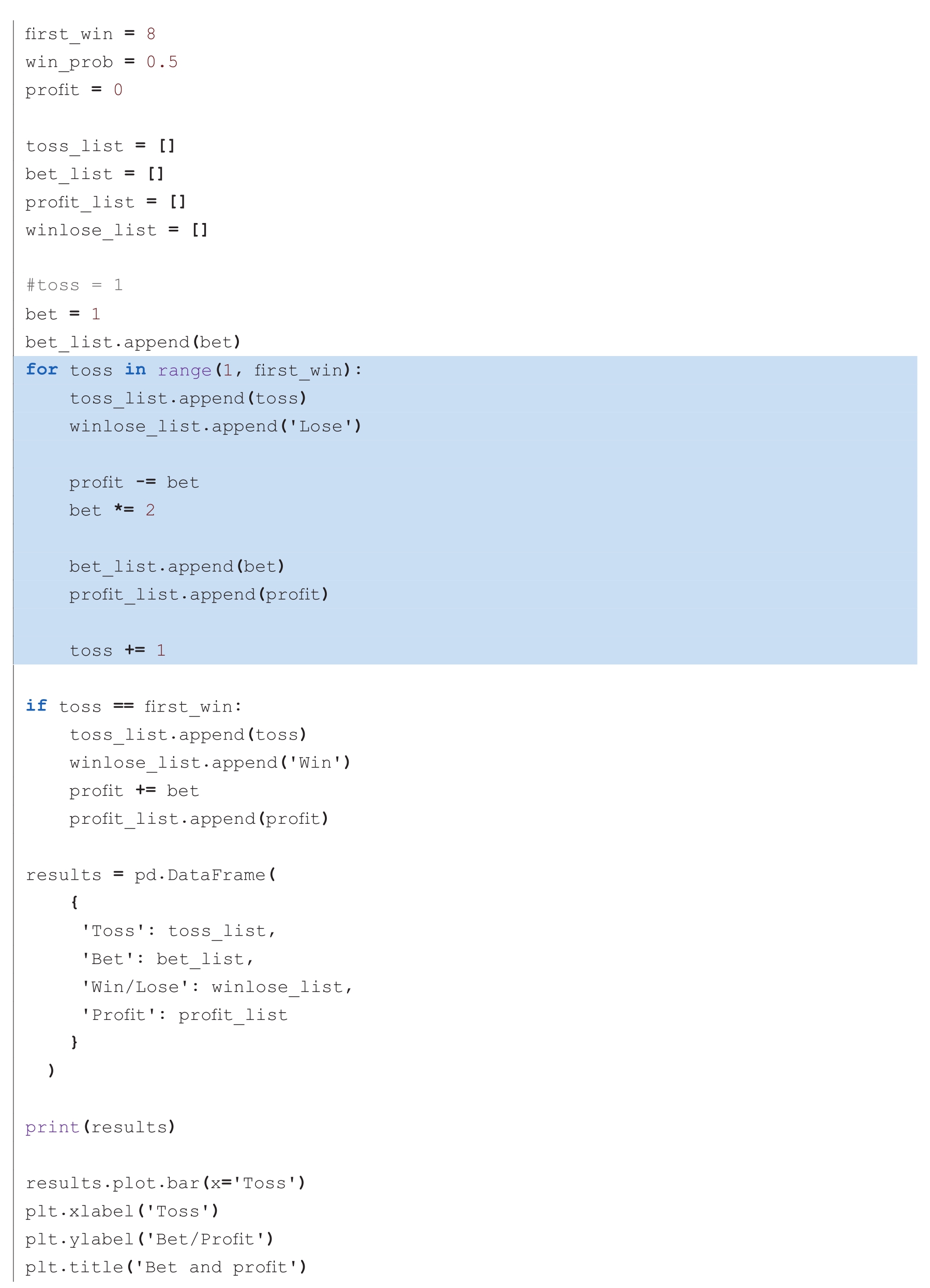 因此,一种与马丁格尔策略类似的投资策略— 反马丁格尔 (anti-Martingale)策略也受到了大量关注。反马丁格尔策略是在某个赌盘里,当每次赢钱时,以2的倍数再增加赌注,若一直赢,就再加倍赌注。感兴趣的读者可以根据本节的介绍,通过修改上述代码,更深入地了解反马丁格尔策略。